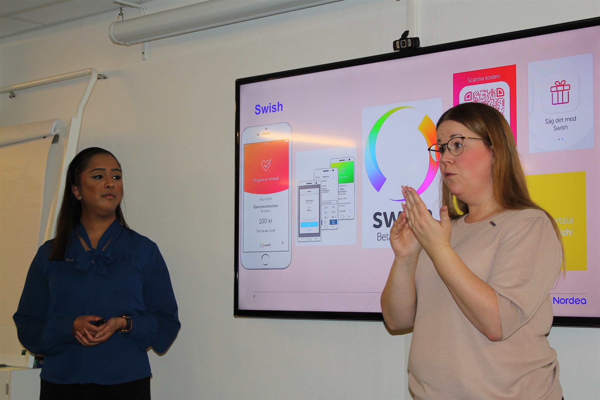 Malin Rodrigo och Ida Johansson informerar om banktjänster via mobilen