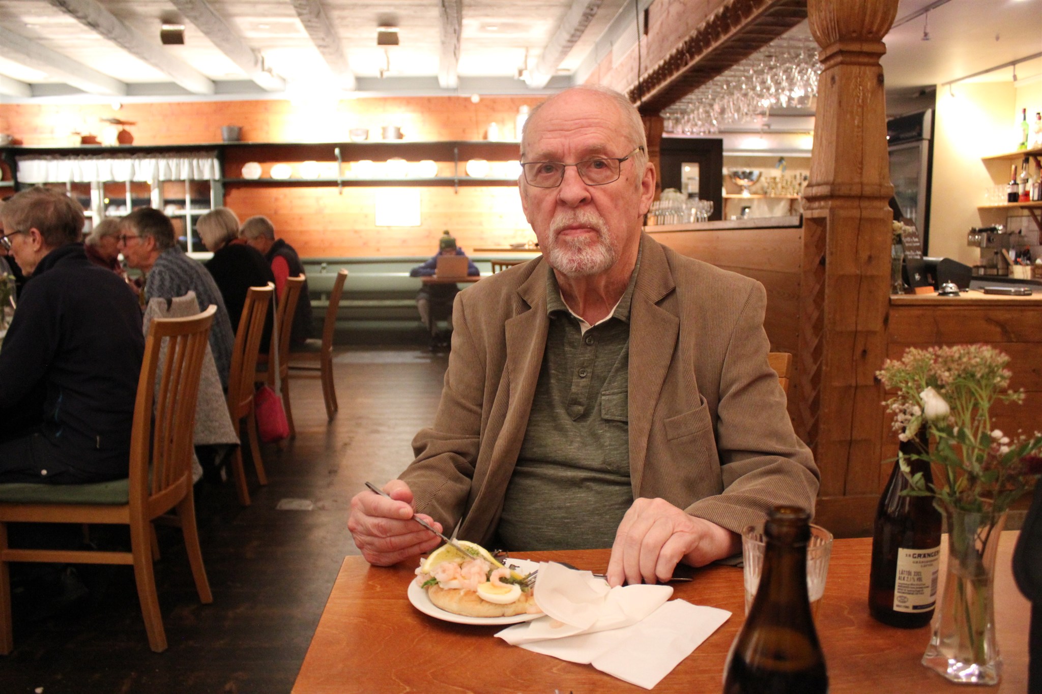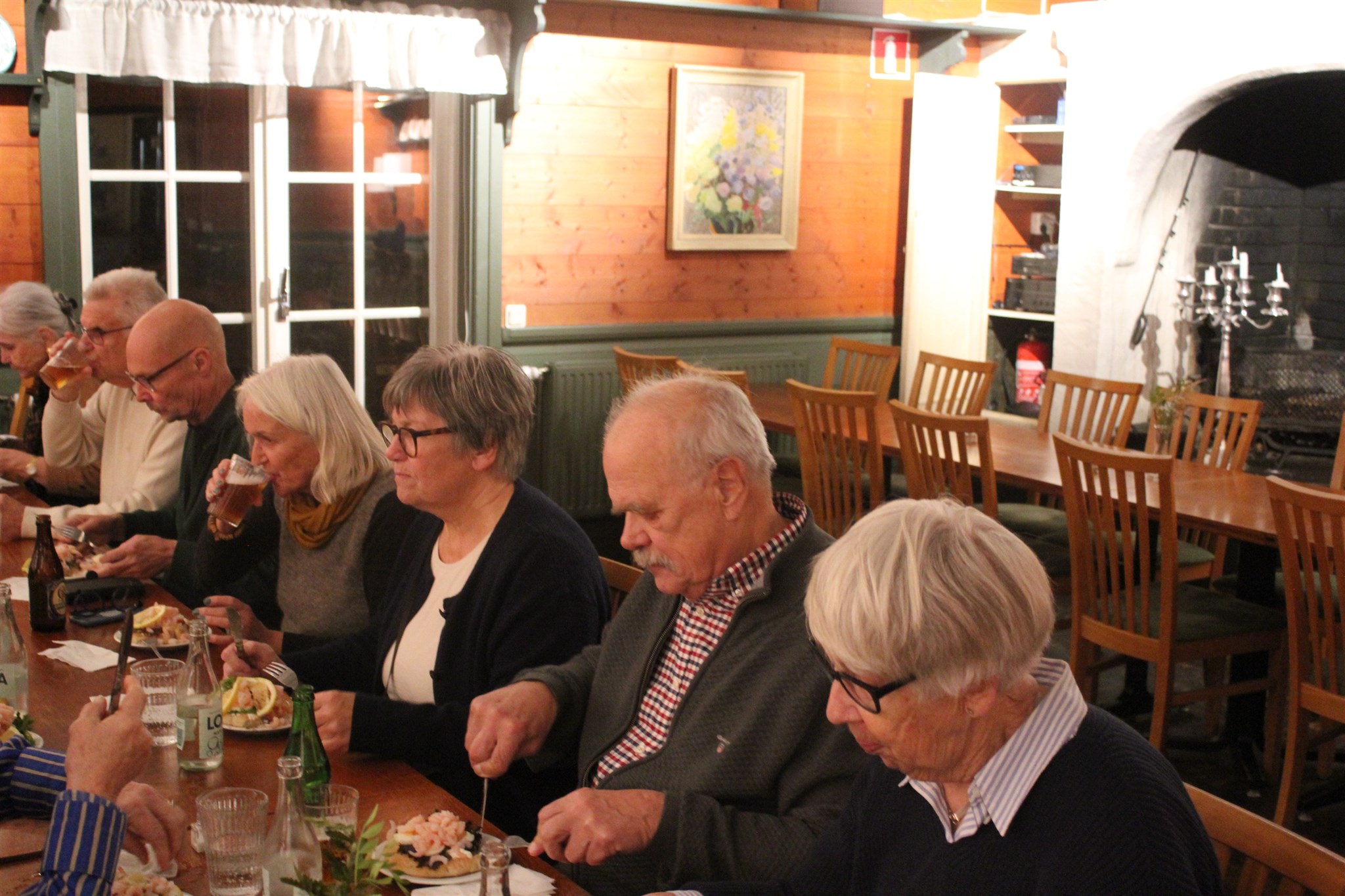 Några av medlemmarna smakar av räkmackan med tillbehör