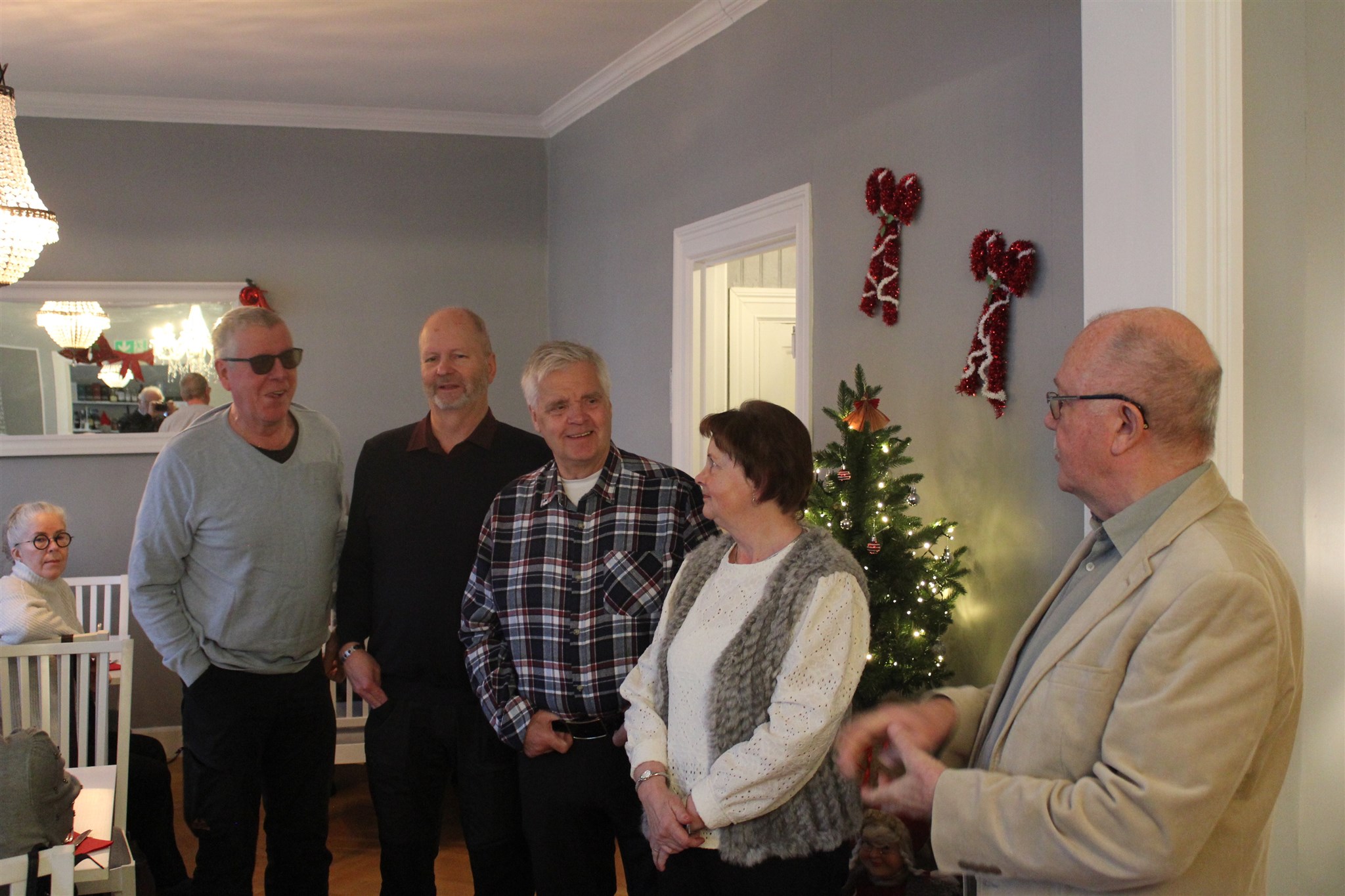 Uppvaktning av fr v Lennart Lundström, Tommy Nilsson, Anders Isaksson och Pia Oskarsson. Present utdelad av ordförande Jerry Sandström