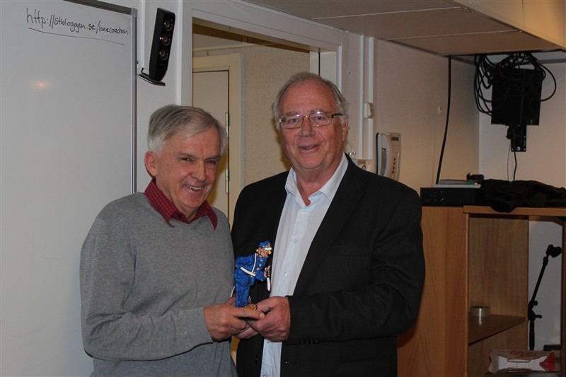 Ordförande Sam Sehlström tackar Lennart Forsberg med gåvan "Bylingen"